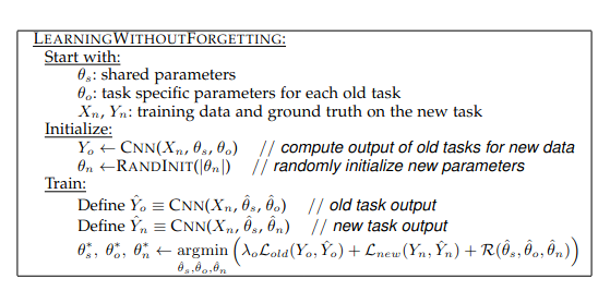 Learning without Forgetting (LwF)2: Uses CNNs; Uses Knowledge Distillation to calculate parameters of current task from the losses of previous tasks, in order to keep them similar and not vary too much. It optimizes the parameters of both the shared and current task at the same time in this process.