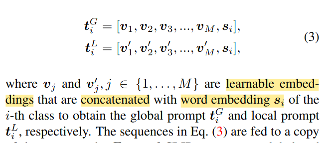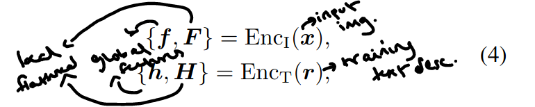 - They use two copies of the Enc_t(r) encoder which comes from CLIP's text encoder for each prompt. Then the global features f, h for image and text embeddings are respectively caluclated along with F, H for local.